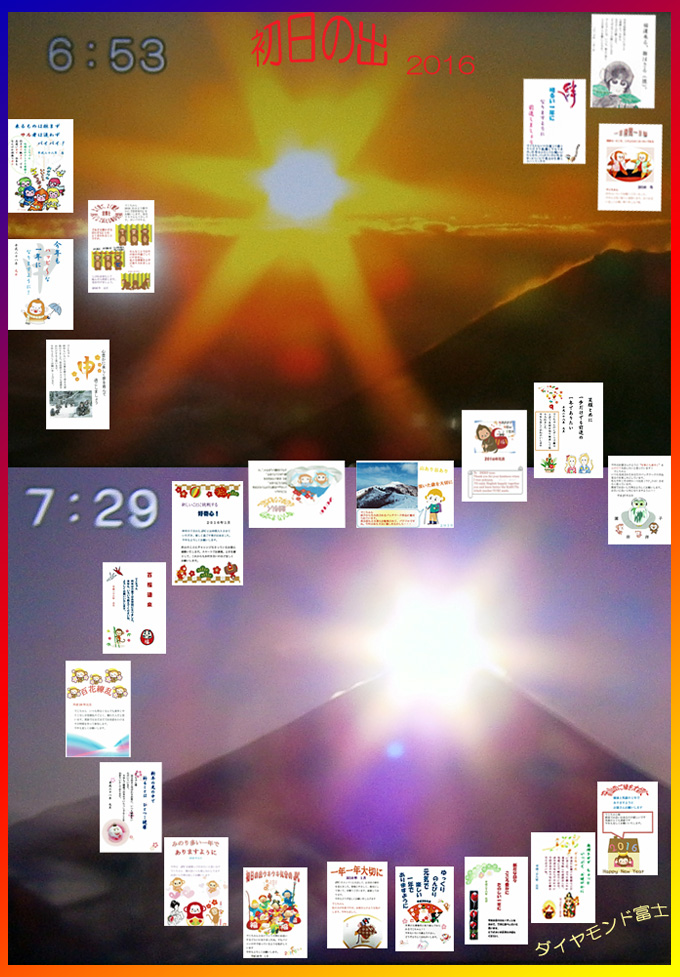 頂いた作品を意味なく並べただけですが、TVの画面の今年の初日の出が、あまりにも美しかったので、カメラで写し、冬ハガキコレクションのバックに使わせて頂きました。