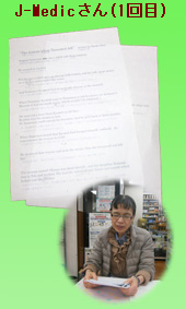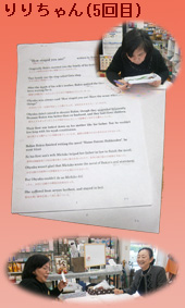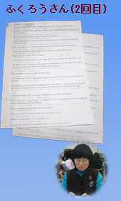 | 荒れたお天気になるとの予報で心配していましたが、それ程でもなく、I was lucky to go to JPC by bicycle.くじを引いて席順表を貰い、20分の持ち時間で、順番に席をかわりペアワークをしました。今回のテーマは「本のあらすじと感想」です。ひと月以上前から先生のお力を借りて、用意した作文を読み合わせて勉強してきた成果を、お相手の文をお互いに読み聞かせて、質問をしました。勿論英語でですが・・・・??今回は総当りでした。 |
