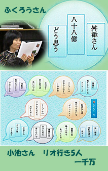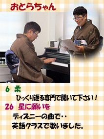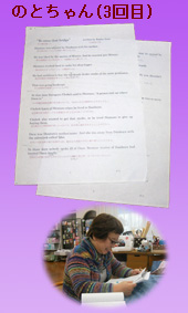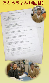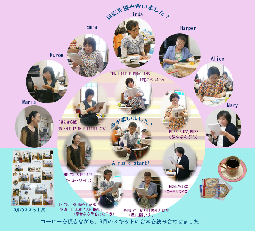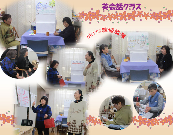 | 半年ほど前から練習しても、なかなか覚える事ができなくて、どうなる事かと心配していたスキットでしたが、何とか、楽しく終わる事が出来てホットしています。今日から又、9月のイベントに向けて、新しいスキットの練習が始まりました。今度は、3カ月しかないのでよほど頑張らなければと思っています。スキットは、どうしても覚えなくてはならないので、大変良い勉強になると思います。先生には、大変お世話を掛けますが、どうぞよろしくお願いします。今日は、朝から充実した時間を有難うございました。 |