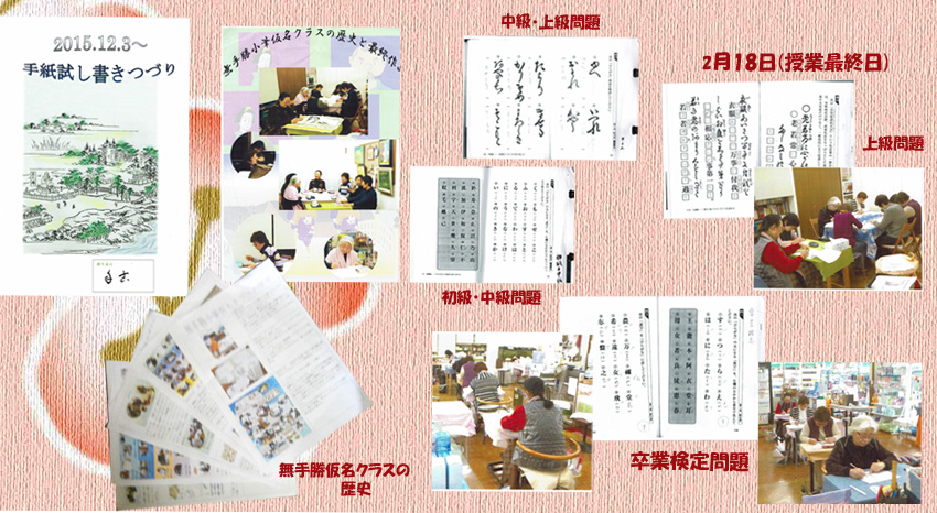 | 昨年の12月3日から8人の内5人のメンバー様に試し書きの候文を書き、訂正しながら読み合わせて、当日の打ち上げパーティに備えました。2月18日の最終日には、総仕上げの、卒業検定試験をして頂きました。先生から、無手勝小筆仮名クラスの2年間の歴史の綴りを頂き、くじけそうになった私に優しく手を差し伸べて下さった先生とお仲間の皆様とご一緒出来た事に感謝して、打ち上げパーティに臨みます。 |