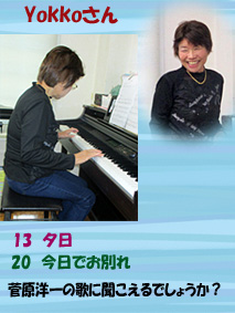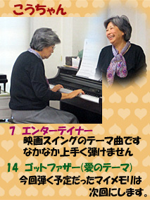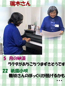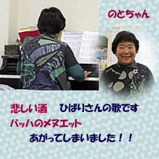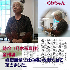 | 6か月とは・・アッと言うまで、又この日がやって来ました。数あるイベントの中で、一番ドキドキします。先生のおっしゃるには、この緊張感も脳トレに良いと・・先生のお話の後、くわちゃんから詩吟の説明をして頂いて、ピアノ珍道中発表会は、始まりました。心のこもったランチを頂きながら皆様の演奏を楽しく聴かせて頂きました。責任重大・・とおっしゃりながら、トリを飾られ、乃木大将が、旅順に向かう途中、長男が戦死した金州城下を望み詠んだ詩を堂々とした声で聴かせて頂き、ピアノ珍道中発表会は終了しました。コーヒータイムで脳に安らぎと刺激を与え、折り紙・あやとりアトラクションを皆で楽しみました。その後、英会話クラスメンバーと希望者の方達とソレイシーさんのレクチャーを拝聴しました。 |