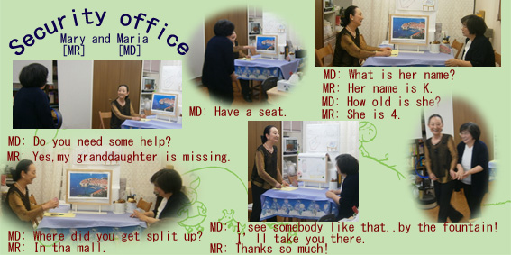 Maryの孫娘が迷子になった時の事がテーマになっています。迷子の祖母がMaryで警備員がMariaです。警備室に来た祖母に、警備員が迷子の孫娘の事を色々聞きます。そして、セキュリティカメラでさがしだして、その場所までお連れするスキットです。 |