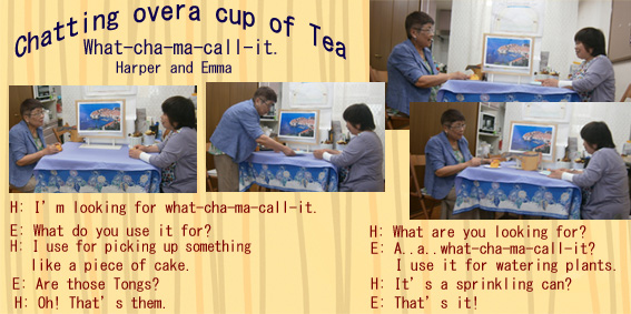 とEmmaが、お茶を飲みながら、アレアレソレソレと言いながら、トングとジョウロを思い出すおはなしです。 |
