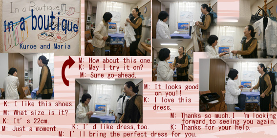 ブティックに来た客Kuroeは靴を買います。その靴にあった服も欲しいと言います。店員のMariaが靴にあう服を選んで来て、気に入ってもらいます。クレジットカードで支払いをして、新しい靴と服を着て、Kuroeは、帰ります。 |