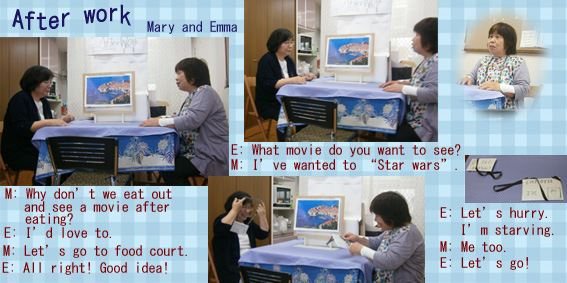 会社の同僚のMaryがEmmaに更衣室で、「明日お休みだから、今から、食事して、映画みない」と話しています。 Emmaも賛成して、近くのフードコートで食事をして、スターウォーズをみることになり、さ~行こうと社員証を置いて行きます。 |