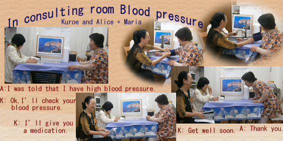 健康診断で、血圧が高いと言われたAlice が、ドクターKuroeの診察室を訪れます。Mariaが血圧を測ります。高血圧は心臓や脳等にダメージを与えるとドクターはAlice に言います。Alice は食べ物と運動で頑張るが薬も欲しいと言います。処方箋を貰って帰ります |