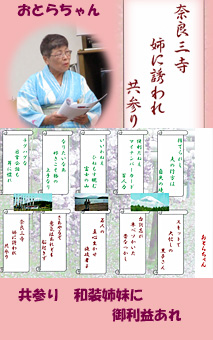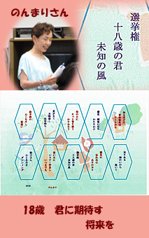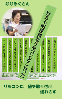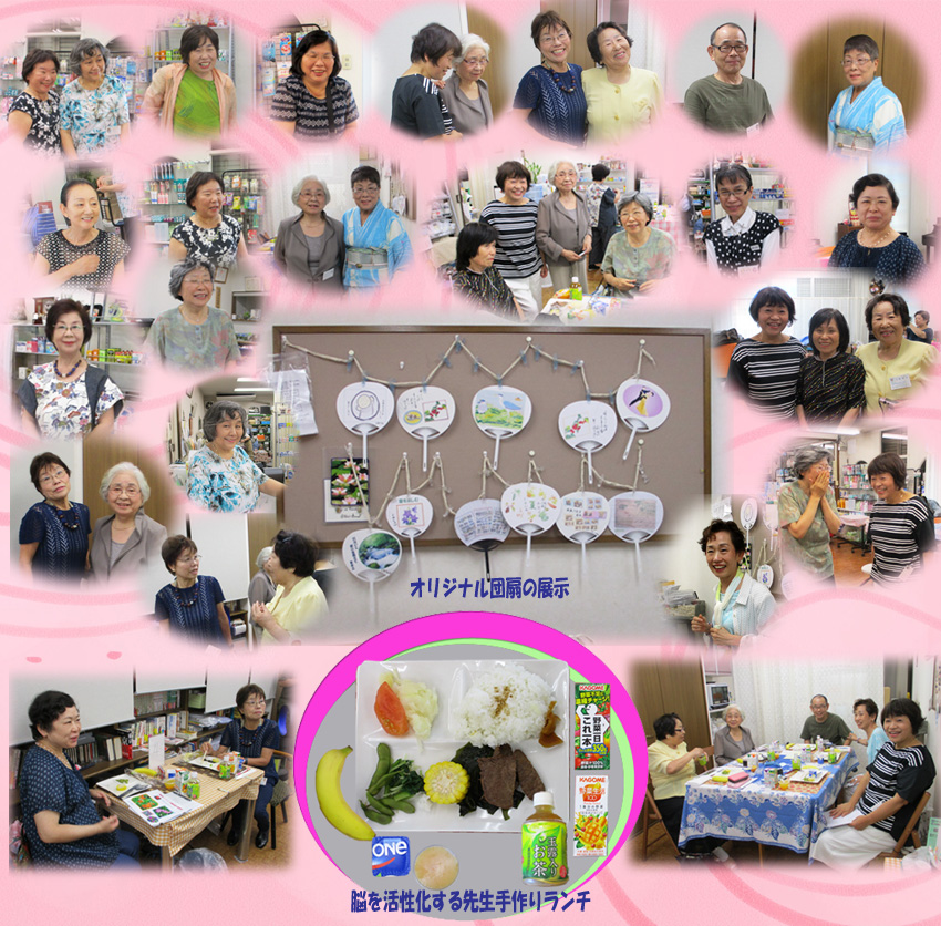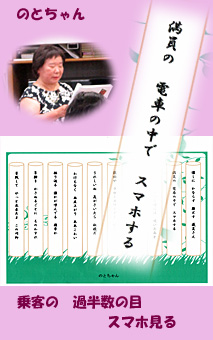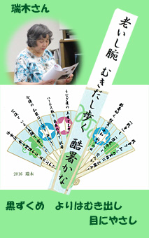 | 9時に万代に寄って、然あらば会の打ち上げパーティで余ったお金で、バナナとヨーグルトを買って、JPC に行きました。今日は、川柳珍道中です。買った品物は、然あらば会からの差し入れにしました。瑞木さんが既に来られていて、関所のお役人さんをして下さっていました。私は、くじで1番の席に座りました。会が始まる前の皆さんの楽しそうな表情をご覧下さい。今年はオリジナル団扇の展示に私は参加しませんでした。それが少し心に残ります。10時から会は始まりました。先生が、欠席された村長さんとMOKOちゃんの作品を発表され、其の後、ランチを頂きながら、順次皆さんの発表を楽しくお聞きしました。 |