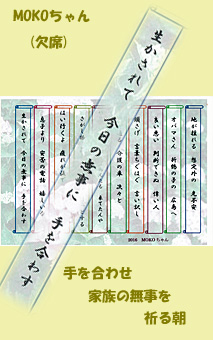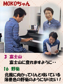 | MOKOちゃんの穏やかな笑顔から、美しく旅立たれ御母堂様を想像した事や、課題を熱心に勉強され、崩し字など難なく読み書きされ、羨ましく思った事を書きました。MOKOちゃんからは、 パッチワークの講習をして、その作品が美しいとお褒頂きました。英会話など書いて下さっているように、集中して勉強したいと思います。 |