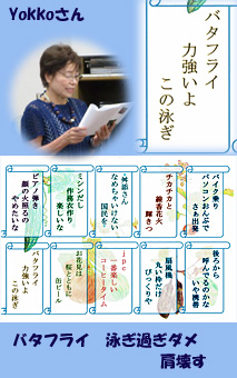 | Yokkoさんは、永年水泳を嗜まれ、何事も速やかで、難しい古文書の崩し字等を難なく読み書き され、羨ましく思った事を書きました。Yokkoさんからは、パッチワークを習った喜びの言葉を頂きました。 |