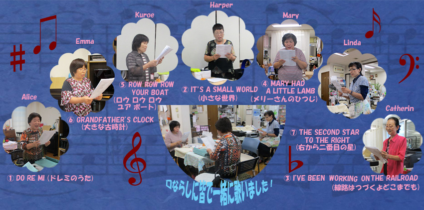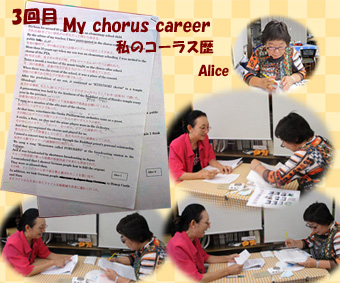 | Aliceのコーラス歴は、60年程前小学生の時から始まり、合唱コンクールにも出たことがあるそうです。30年程前息子さんが小学生の時、ママさんコーラスに入り、卒業後は、20人程で「くすのきコーラス」として続き、ドイツへ演奏旅行にも行き、ケルンの放送局で歌った「故郷」が短波放送で日本でも流れたようです。ドイツで、折り紙を教えたり、ドイツから来た方を、姫路城や奈良に案内したり、コンサートを一緒にした時、英語が話せていたら・・と今残念に思っているとのことです。現在は、毎年、「一万人の第九コンサート」に参加して楽しんでいる事などを教えてくれました。 |