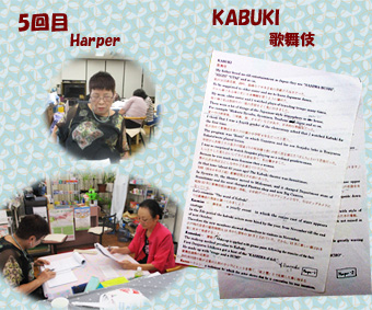 | Harperは歌舞伎の用語を教えてくれました。〇Kaomise(顔見世)役者の新年11月に 新しい顔ぶれを客に見せて発表する事。〇Kumadori(隈取)歌舞伎独特の化粧法〇Keren(外連)宙乗り・欄間抜け等 〇Kouseki(口跡)台詞をいう時の発生法〇Suppon(すっぽん)花道にある小さな「せり」〇Hanamiti(花道)舞台から客席を縦断するように同じ高さで張り出したもの。〇Hikinuki(引き抜き)糸で仮止めしている上の衣装の糸を引き抜くと下の衣装が表れる方法。帯を堺に上・下裏返しに垂れているのを「ぶっかえり」と言う。〇Maneki(まねき)勘亭流の書体で役者の名が書かれた木の看板〇Roppou(六法)片手を大きく振って勢いよく足を踏み鳴らしながら花道をひっ込む。 |