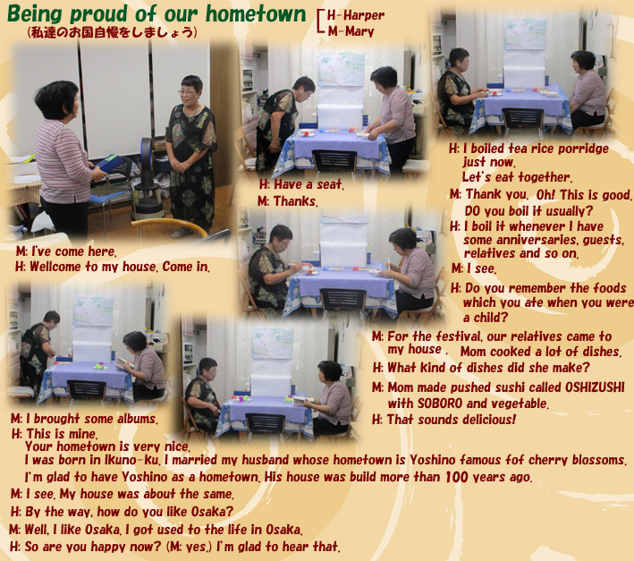 | ソレイシーさんのテキストを使って、勉強しているので、親しみ深く楽しく聞かせて頂きました。ソレイシーさんは、日本に来て、嫌な思いを沢山なさった事と思われます。それは、日本人が悪気があってしたのではなく、島国根性で接した事が差別のように思われたような気がします。私も他国の人を見ると敬遠しがちになってしまって・・・駄目ですね!!世界は一つ、人類皆兄弟・・お隣さんとお話するように、気楽に 接するようにしなければ・・・と肝に銘じました。日本語を、英語で一言で表すのは難しい・・色々な表現方法があるので、簡単な単語をつなぎ合わせて文を作っていけば良いとも・・これは、何時も先生がおっしゃっていることですが・・・上手な日本語で大変勉強になりました。その後、来月のイベント、英会話クラスパーティのスキットの練習をして、その週のある1日の日記を読み合って、本日の予定が全て終了しました。大変疲れましたが、有意義な1日でした!!先生・皆様に感謝です。有難うございました。 |