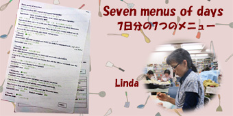 Lindaにはランチに毎日添えてあるYASAIJIRU(JPCオリジナルシチュー)と一週間の料理・・〇Monday(月曜日)NIMONO(煮物)〇Tuesday(火曜日)TERIYAKI of pork and Gernish(豚肉の照り焼きと付け合わせ)〇Wednesday(水曜日)Japanese curry rice and Pickled cucumber(カレーライスとキュウリの漬物)〇Thursday(木曜日)Bite-size steak and Gernish(一口ステーキと付け合わせ)〇Friday(金曜日)UNADON and Assorted pickles of vegetables(ウナギどんぶりと野菜の漬物盛り合わせ)〇Saturday(土曜日)CHIRASHI-ZUSHI(ちらしずし)の作り方と料理用語を教えて頂きました。 |