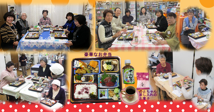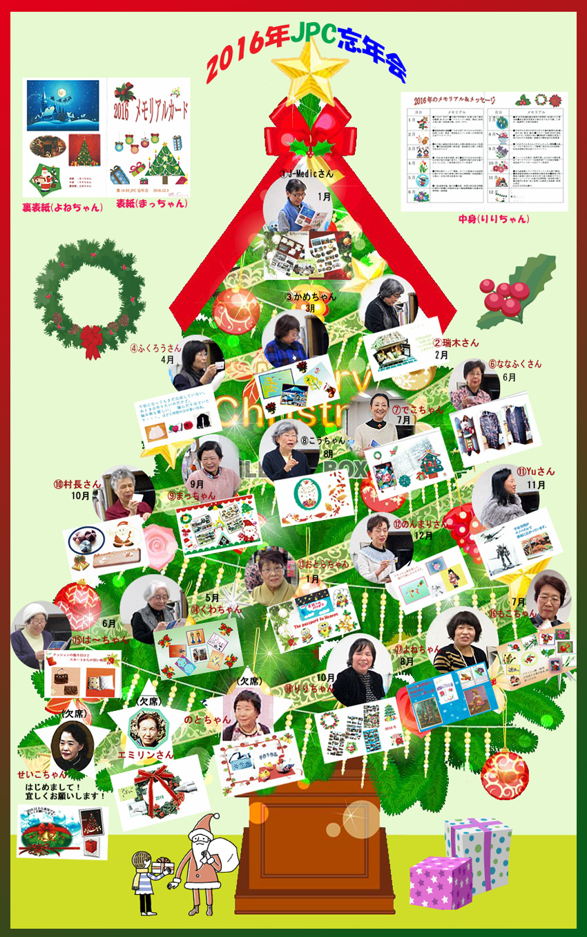 9時30分頃には、既に多くの方が来られていました。抽選で席番と発表順と月を引いて、名刺を交換しました。発表順に名刺を整理するのに時間が掛かって、10時を大幅に回って、忘年会が、始まりました。名刺の制作秘話や当たった月を振り返って、ニュースや思い出話等、私もその時の事を思い出しながら、楽しく聞かせて頂きました。私は、7月だったので「三毛猫ファンの集い」で楽しんだ後、祇園祭の雰囲気を味わせて頂いた事などをお話しました。お食事をしながら・・という事だったのですが、誰もお弁当に手を付けず、皆の発表が終わった後、ゆっくり頂きました。1時頃から、コーヒーを頂きながら、折紙とあやとりをしました。3日前には、ほぼ完全に覚えたと思っていたのに、いざしてみると、あやとりが覚えきれておらず、皆さんに迷惑をかけてしまいました。1時過ぎに、忘年会は笑いの内に終わりました。その後、私たち英会話クラスのレッスンをして頂きました。skitsの練習や日記等をしました。先生には感謝感謝です。今日は、楽しくて有意義なひと時有難うございました。今年も後僅か・・元気で年が越せますように・・・・ |