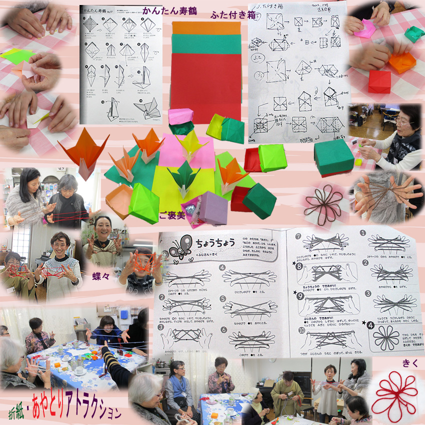 ピアノ発表会の後コーヒーとお菓子を頂きながら、折紙とあやとりをしました。英語のレッスンの前に、皆さんを指導する為に練習しているのですが、自分では、出来ても、人に教えるのは、難しい事を何時も感じます。折り紙もあやとりも脳トレに良い事は皆知っているので、子供にかえって、真剣です。1時前に今日のパーティは笑いの内に終了しました。が、私たち、英語クラスのメンバーは、これから、英会話のレッスンが続きました。先生有難うございました。今日は、楽しい有意義な時間を持つことが出来ました。来年の発表会の為に練習に励みたいと思います。 |