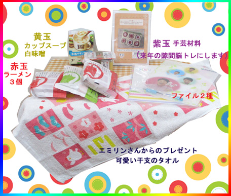 白味噌でお雑煮を作り、手芸材料は、来年の隙間脳トレ作品の一つにしたいと思います。エミリンさんから今年も来年の干支の可愛いタオルを頂き、有難うございました。