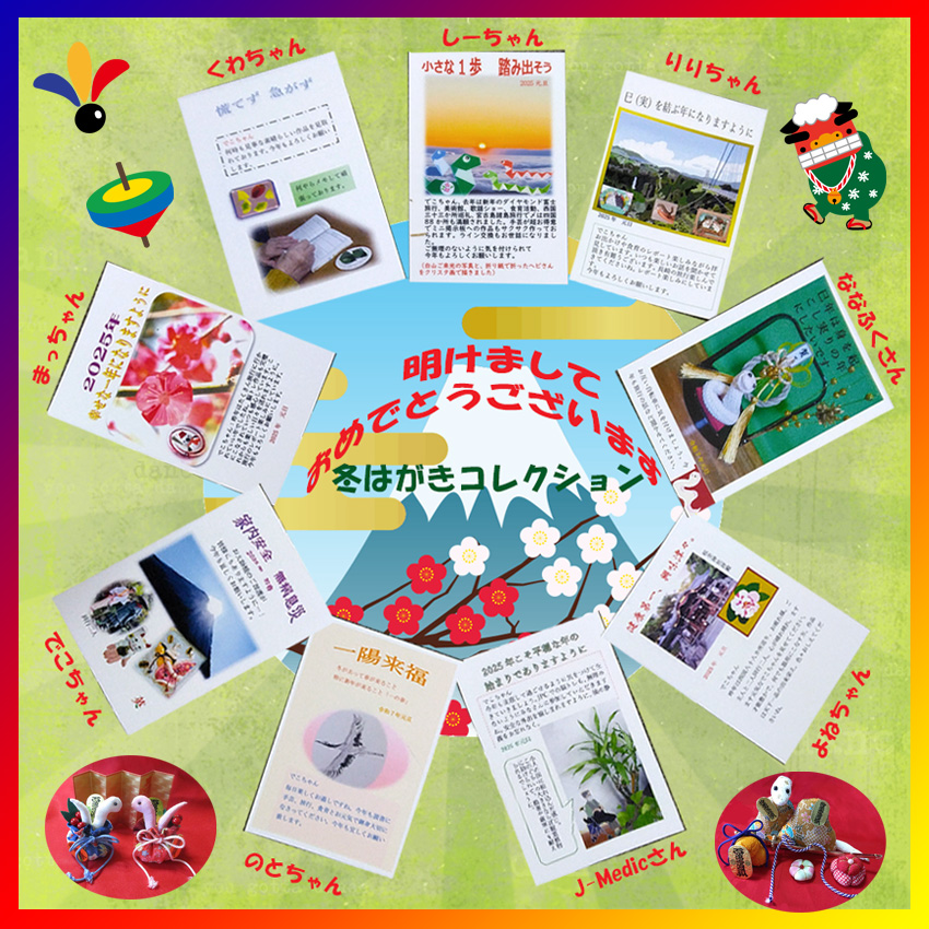 | 明けましておめでとうございます。2025年元旦に素敵な冬はがきを頂きました。皆様が贈って下さった、言葉や格言を肝に銘じて、健康第一・慌てず急がず・小さな一歩から踏み出して・実を結ぶ・実り多い・幸せな1年になるように心掛けたいと思います。今年も宜しくお願いします。 |