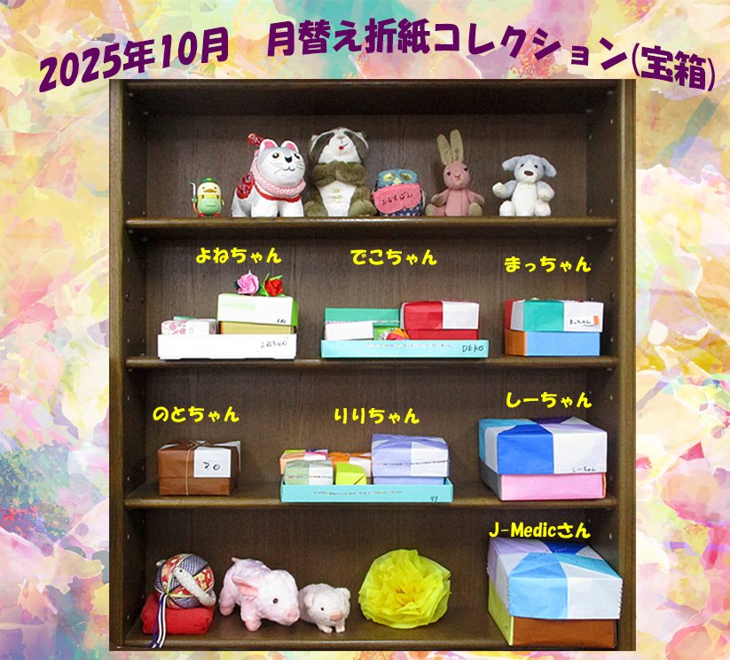 今月の折紙コレクションは、宝箱コレクションで、今までに習った折紙のお宝を箱に入れて展示するのが課題でした。