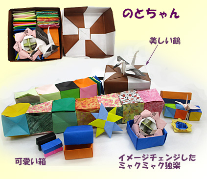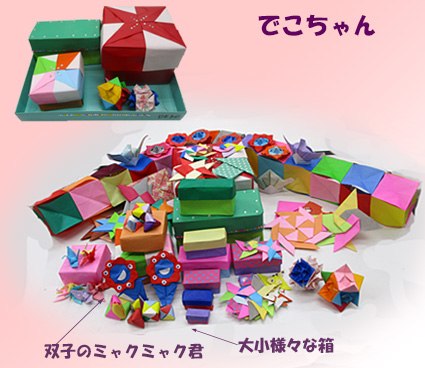 大きな箱の中には、各種手裏剣やブックマーカーのお宝で一杯。小さい箱には、見事に小さく折られた鶴やくす玉・手裏剣等が…目をみはりました!大きなスパイラルキューブをお宝にしないなんて、りりちゃんらしいですね。小さなスパイラルキューブもマジックキューブも見事です。ミャクミャク君も可愛いです! |