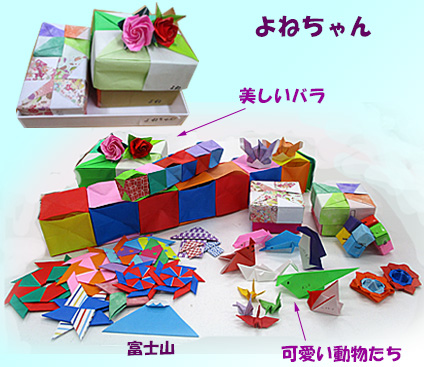 ドキドキしながら蓋を開け、出来るだけ入っていた箱の側にお宝を並べる事にしました。素晴らしいお宝で一杯です。同じ物でも色や大きさが違うので、勉強になります。色々多くの折り紙を教えて頂いて感謝すると同時に、折り方を忘れている自分…1歩進んで2歩下がる…せめて現状維持が出来るように脳トレに励みたいと思います。 |