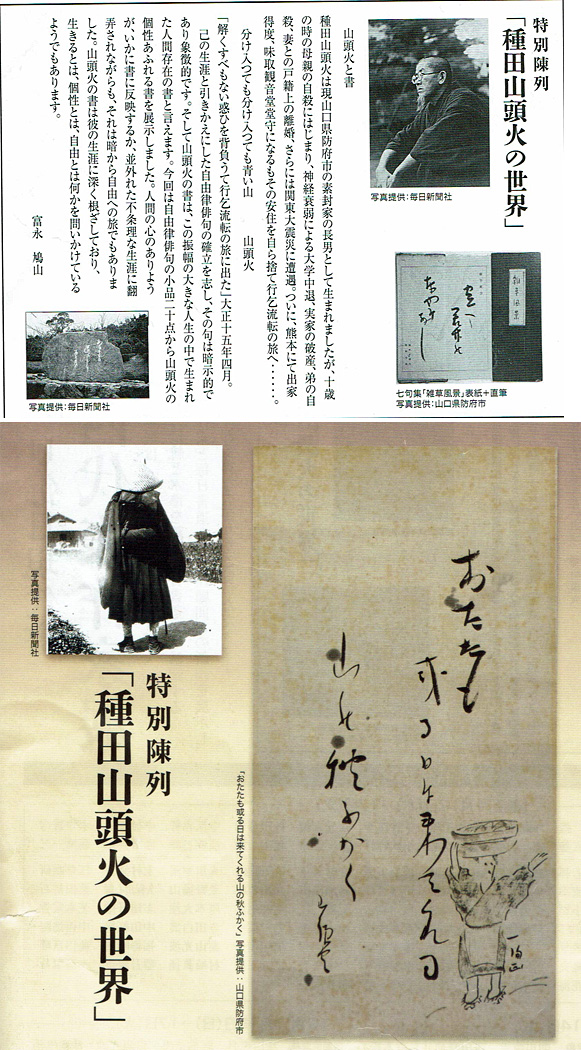 | 今年も関西代表作家展に行ってきました。昨年は然あらば会が存続していたので、立ち止まっては、読もうと・・・ 今年は、芸術作品として、字の美しさを楽しんできました。それでも、変体仮名等を目にするとつい立ち止まって、皆で勉強していた当時の事を思い出し、なつかしくなりました。現代書なので、あまり古典文字は使われていませんでしたが、特別陳列の「種田山頭火」の作品には変体仮名が使われていましたので、ゆっくりと読みながらその世界に浸たりました?(山頭火の事は上部画像をクリックして下さい) |