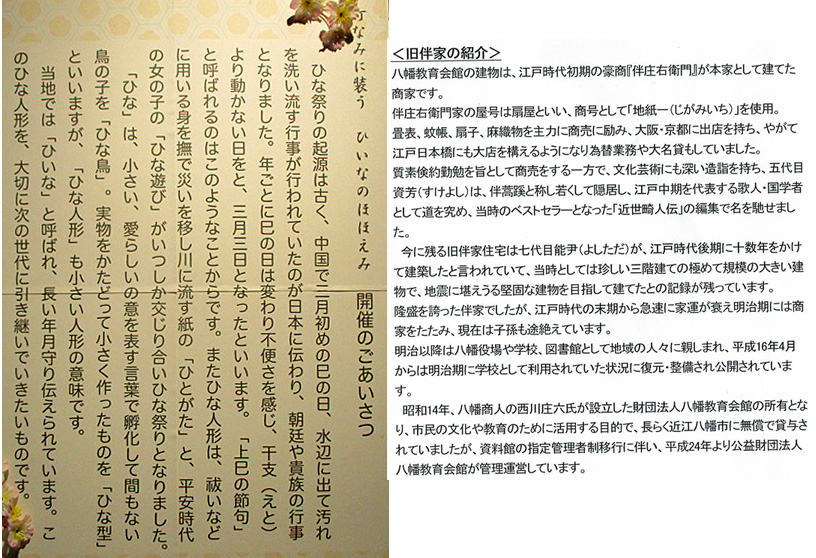 | グリーンパーク山東を後にして、近江八幡の日牟禮(ひむれ)神社の境内にバスは着きました。白雲館で地図を貰って、近江八幡節句人形めぐり「町なみに装うひいなのほほえみ」に会いに行ったのですが、お店はどこも閉まったままで、町なみはシ~ンとしていました。定休日が火曜日のようで、とても残念でしたが、市指定文化財の旧伴家住宅(八幡教育会館)で多くの雛人形が展示されているという事だったので行って見学しました。歴史ある建物の中に展示されている、多くの雛人形に囲まれると何だか不思議な感じがしました。明治期の物を見つける事が出来なかったのですが、江戸・大正・昭和とお顔が違います。その時代好まれた美人顔がモデルになっているのでしょうか・・?引き出しの中の小物は、今でも参考になりそうでした。今回の旅は、雪がちらつく中、古い町並みを散策出来て幸せでした。又、同席した方が、とても素敵な方で、東部市場の近くに住まわれていることで、親しくお話が出来て幸せでした。思った程寒くなく、6時30分頃無事に天王寺公園前に着きました。(旧伴家とひいなの事は、上部画像をクリックして下さい) |