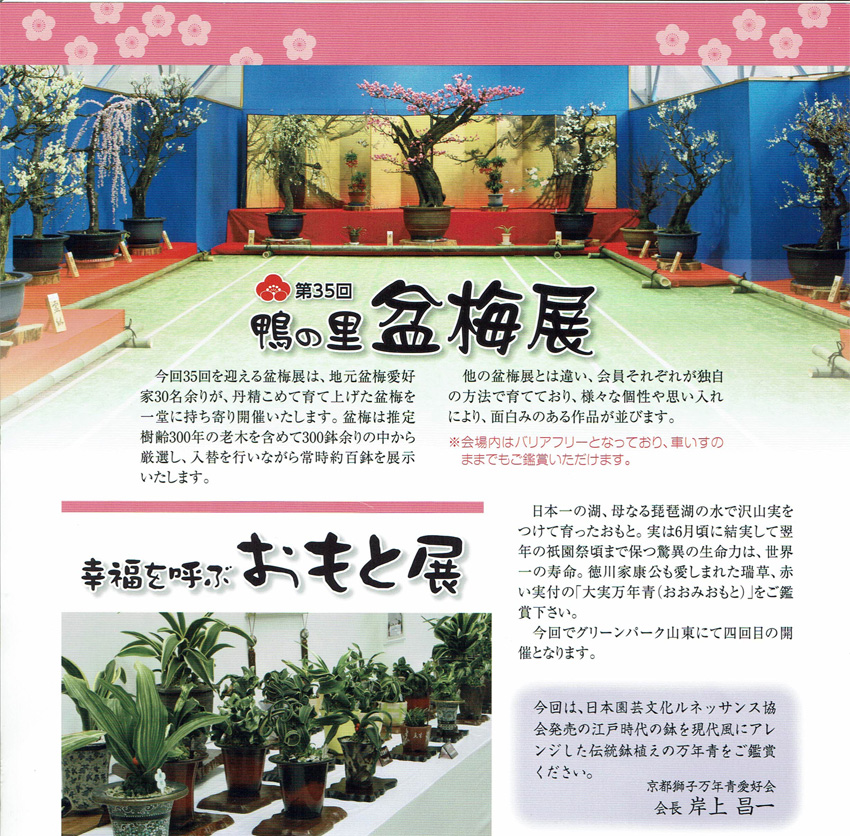 | 食事の後、米原市のグリーンパーク山東で催されている「鴨の里 盆梅展 おもと展」に行きました。長浜の盆梅展と違って、広い会場に展示されているので、ゆっくりと香しい白梅紅梅を観賞する事ができました。万年青(おもと)にも色々な種類があり、多くの万年青から長寿と幸せを頂いたような気がしました。(盆梅と万年青の事は上部画像をクリックして下さい) |