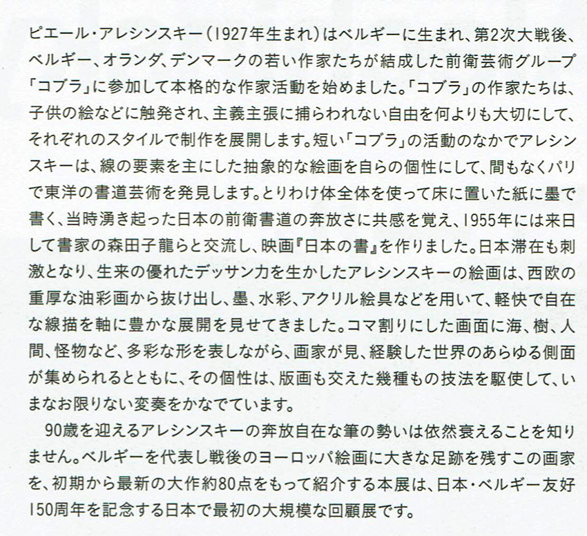 | りりちゃんのリハビリの関係で、 お見舞い時間が短くなったので、日本・ベルギー友好150周年を記念する日本で最初の大規模な回顧展と言う、ベルギーを代表する画家「ピエール・アレシンスキー展」を観賞しました。左利きだったのに、学校生活で右利きに矯正され、唯一許されたのが、美術の時間だけだったそうです。そこで、絵画に夢中になり、画家になったようです。左と右を使える彼の脳は独特な前衛画風を作り、凡人の私には、理解の出来にくい作品が多かったように思いました。ただ、和紙を裏打ちして前衛書道を取り入れた作品も多く、興味深く見学しました。その後、お隣の大阪市立科学館でプラネタリウムを見ながら、うつらうつらして、脳を休めました。その後、難波で買い物をして帰りました。(絵の写真は、チラシからです。アレシンスキー氏については、上の画像をクリックして下さい) |