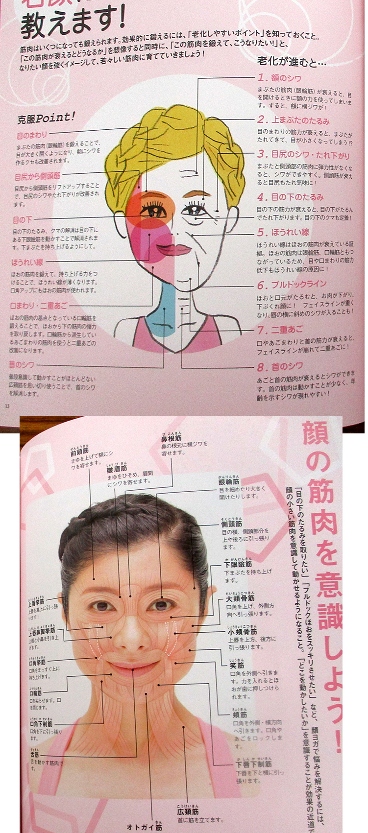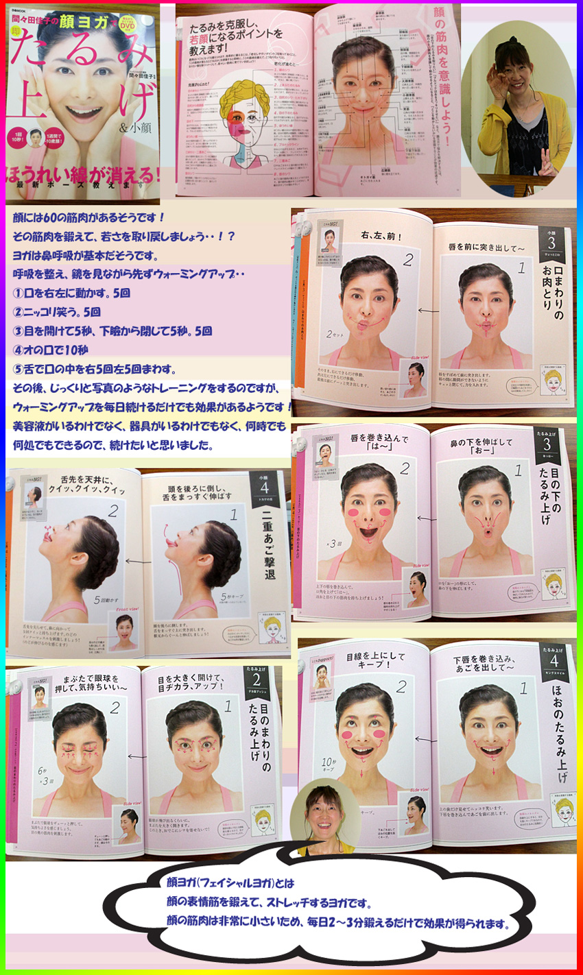| インストラクターの先生に偶然お会いして、お誘い頂いたので、講習を受けてきました。大変有意義な講習でした。もう少し若い時、しわが刻みこまれない前に受けていたらと悔やまれます。それでも淡い期待を抱いて、これ以上しわが寄らないように 顔ヨガを続けようと思います。(顔の筋肉の事は、上の画像をクリックしてください。) |