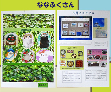 | 表紙は、可愛らしい動物のクリスタ画と作品をツタの画像に合わせて素敵です!詩吟や裁縫等沢山のご趣味をお持ちの中、料理の腕は相当なものですね!何時も感心して見ています。8月の作り置きのハンバーグやブルーベリージャム作りが心に残りました。 |