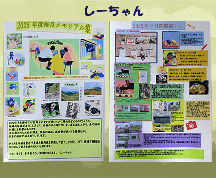 表紙のI先生の後ろ姿のクリスタ画、素敵です!9月は、お孫さんのピアノの発表会に、映画「国宝」の橋捜し等面白いです。又毎月のマイクッキングは、楽しみに見せてもらっています。山登りだけでなく色々な事に挑戦されて素晴らしいと思います。 |
