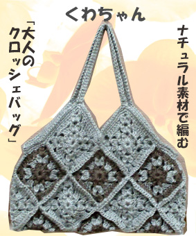 麻の糸は、割れ易く編むのは大変だったと思います。19枚のモチーフを細編みで繋ぐことに難儀されたようですが、立体的な素敵なバッグで、仕上がりの美しさに目を見張りました! |