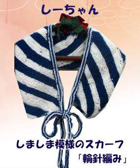 | 細い糸で、しましま模様をバイヤスに編んでいくのは大変だったと思います。最後まで仕上げられ、頭が下がります。2作目を制作中とか…頑張って下さい! |